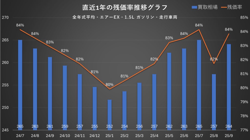 グラフを見ると、直近1年で残価率はおおむね80〜84%で推移しています。冬場にかけて下振れした局面(約80%)がありましたが、2025年春以降は回復基調に入っており、直近では84%前後で落ち着いています。