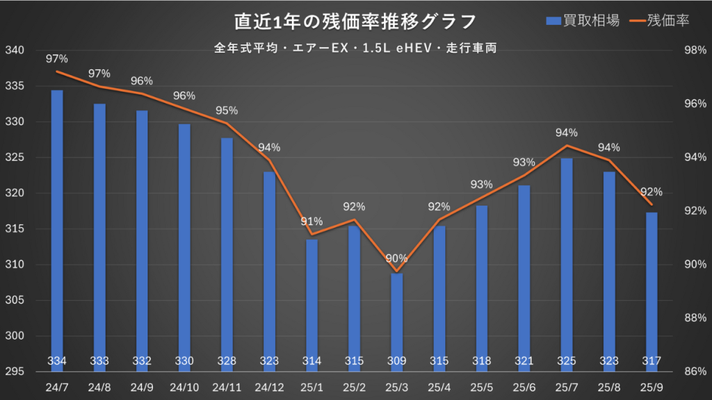 グラフでは一時的にやや低下した箇所が見られますが、その後は持ち直し、再び92〜94%台の安定域に回帰しています。国内のハイブリッド需要が強いこと、燃費評価が中古でも残価を支えていることが主因です。