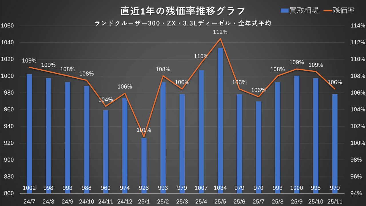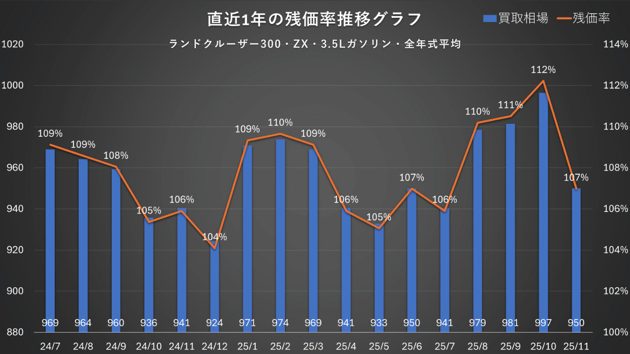 2025年の春には残価率が112%に達するなど一時的な高騰を見せましたが、その後は少し落ち着き、現在は106%~109%前後で安定して推移しています。