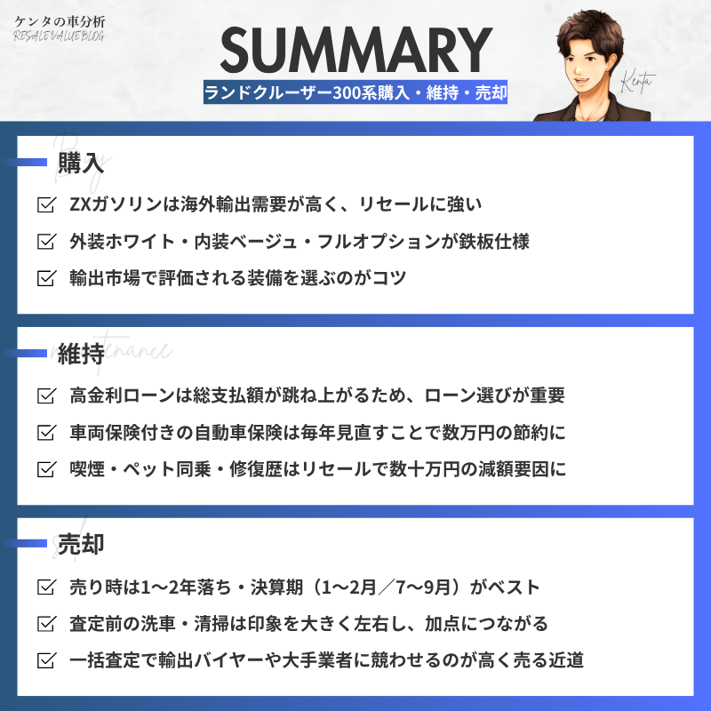 ランドクルーザー300系は、購入する場所やグレード選び、普段の維持方法、そして売却タイミングまで、どんな選択をするかで満足度も出費も大きく違ってきます。