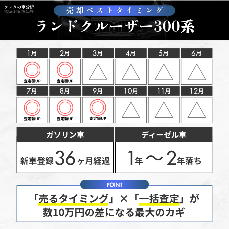 ランクル300系を一番高く売るには、業者の「仕入れ需要」で価格が上がる時期を狙います。それは、決算セールを控えた「1〜2月」と「7〜9月」です。