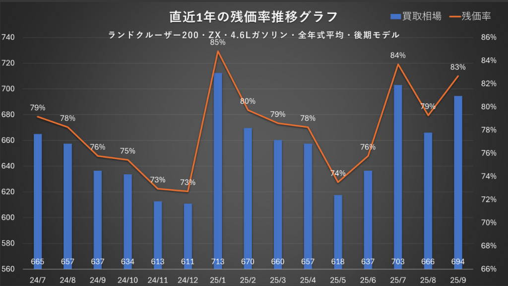 グラフを見ると、相場は年間を通して上下しているものの、2025年の夏頃から再び上昇に転じ、9月には残価率112%という非常に高い水準に到達。