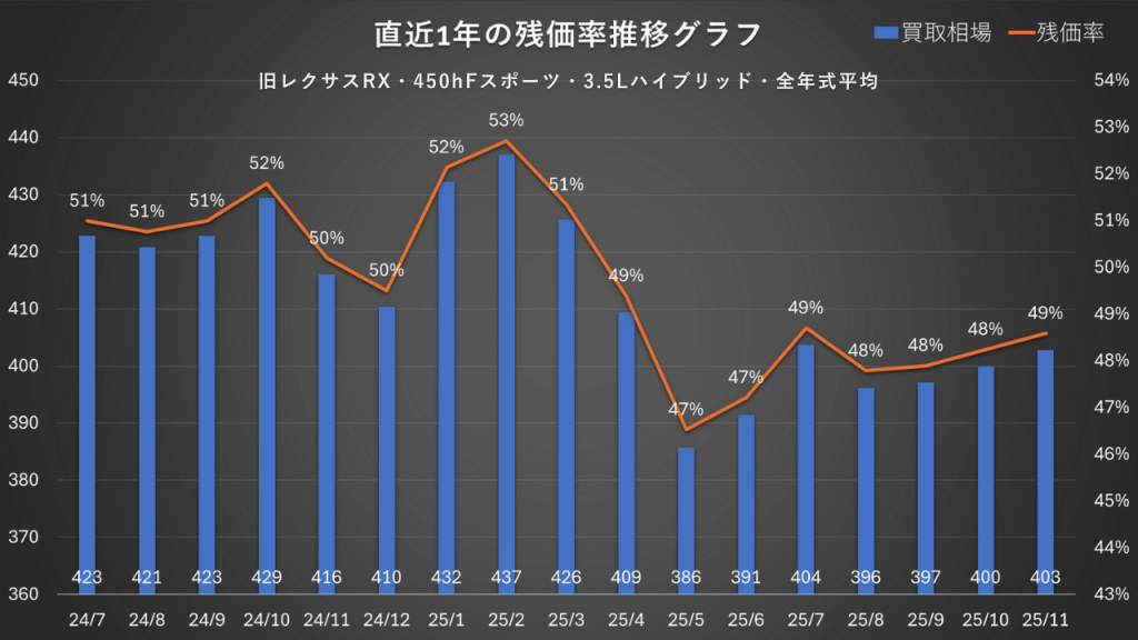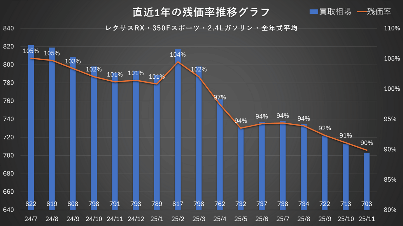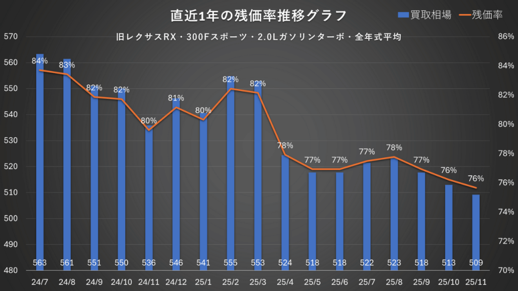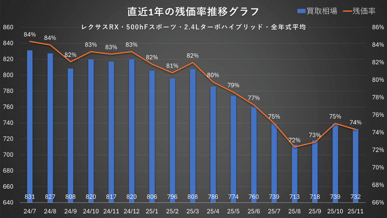 レクサスRXのリセールを考えるうえで、実際の相場がこの1年でどう動いたかは見逃せないポイントです。