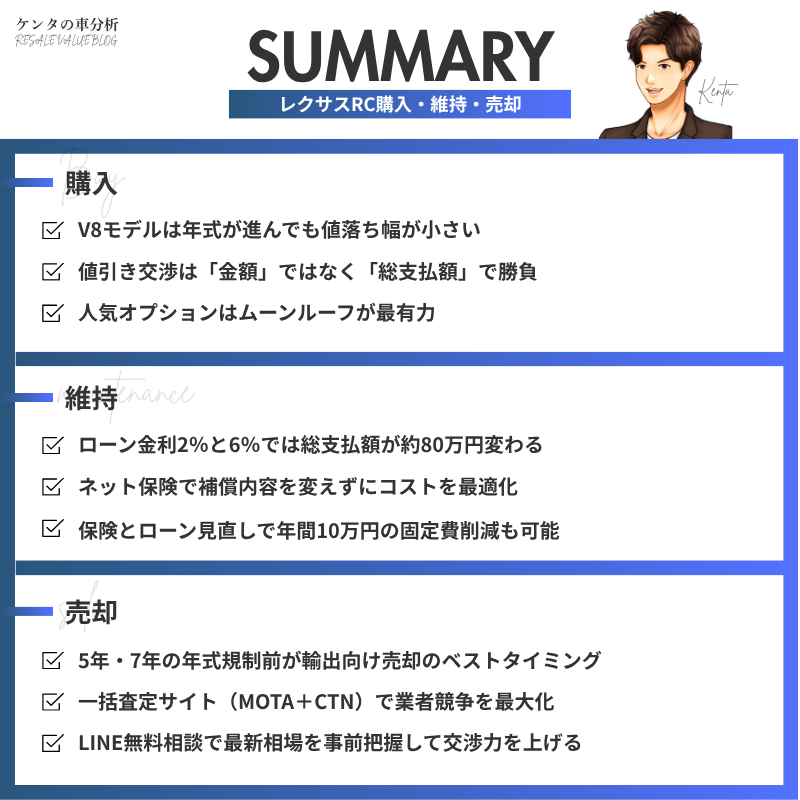RCは、同じクルマでも売り方ひとつで数十万円の差が出るクルマです。デザインも走りも特別な一台だからこそ、最後の手放し方も丁寧に選びたい。