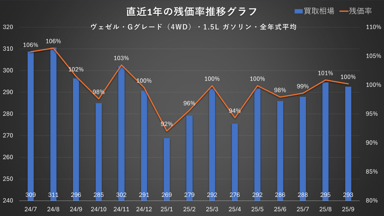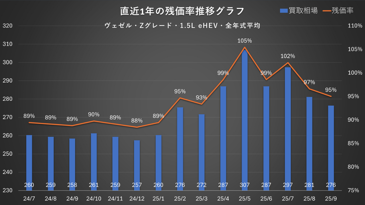 今回のグラフを見て分かる通り、ヴェゼルeHEV(Zグレード)は2025年春にかけて残価率が一時的に105%まで跳ね上がり、新車価格を上回る買取相場を記録しました。