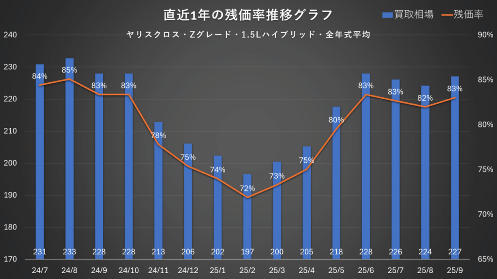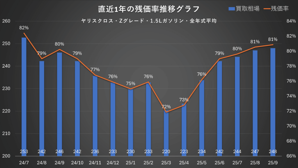 注目すべきはその後の回復力で、夏には83%まで上昇。直近も高い水準で安定しています。市場での根強い支持がうかがえる、優秀なリセールバリューですね。